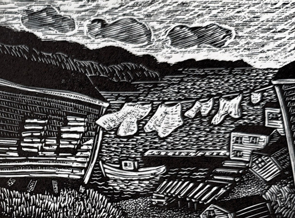 “Oh Bonaventure, your hills will always keep me from all harm” from Sweet Bonaventure by poet Des Walsh. A wood engraving by Alan Stein.